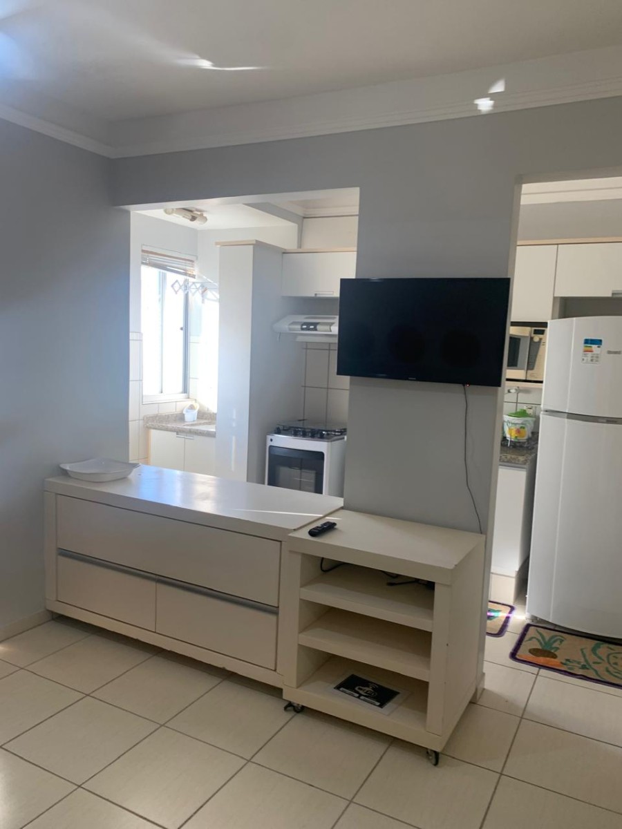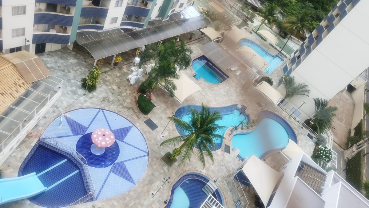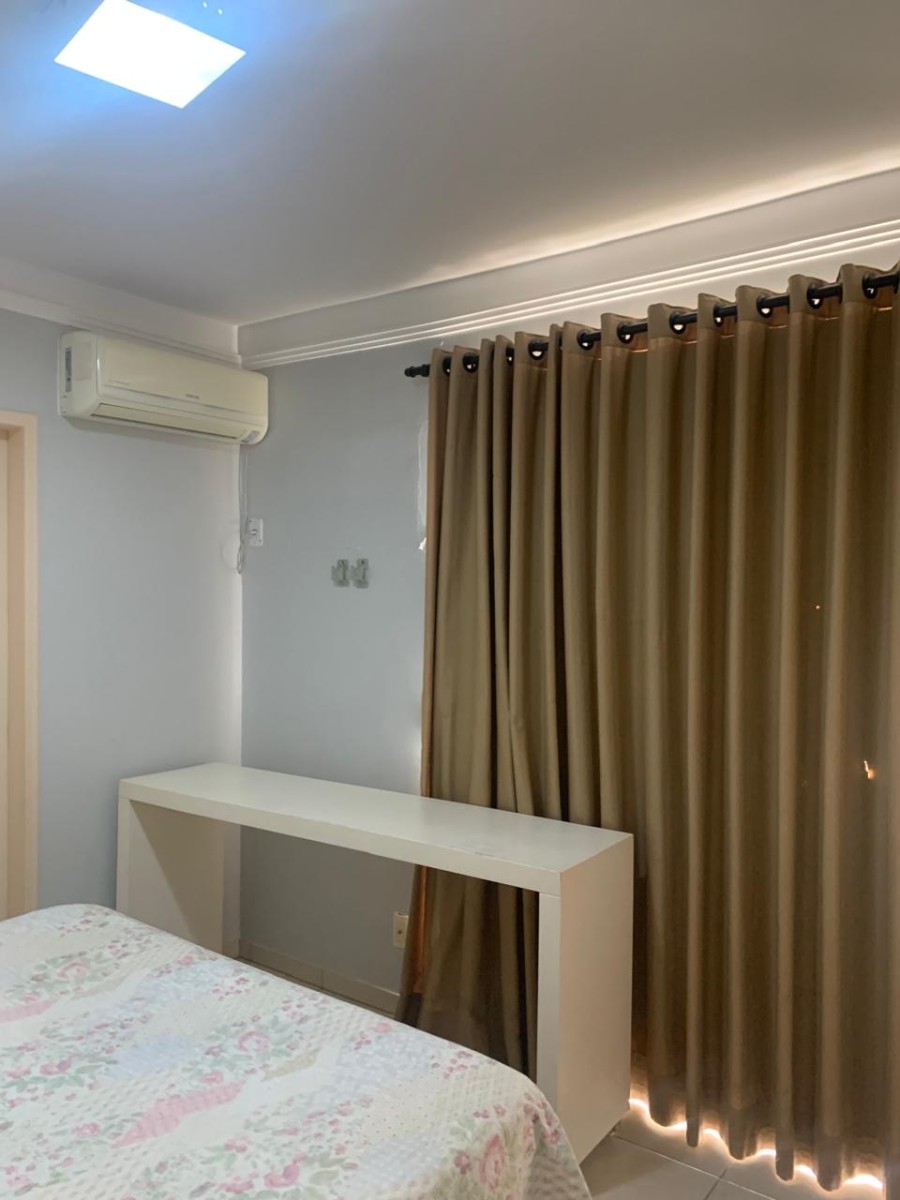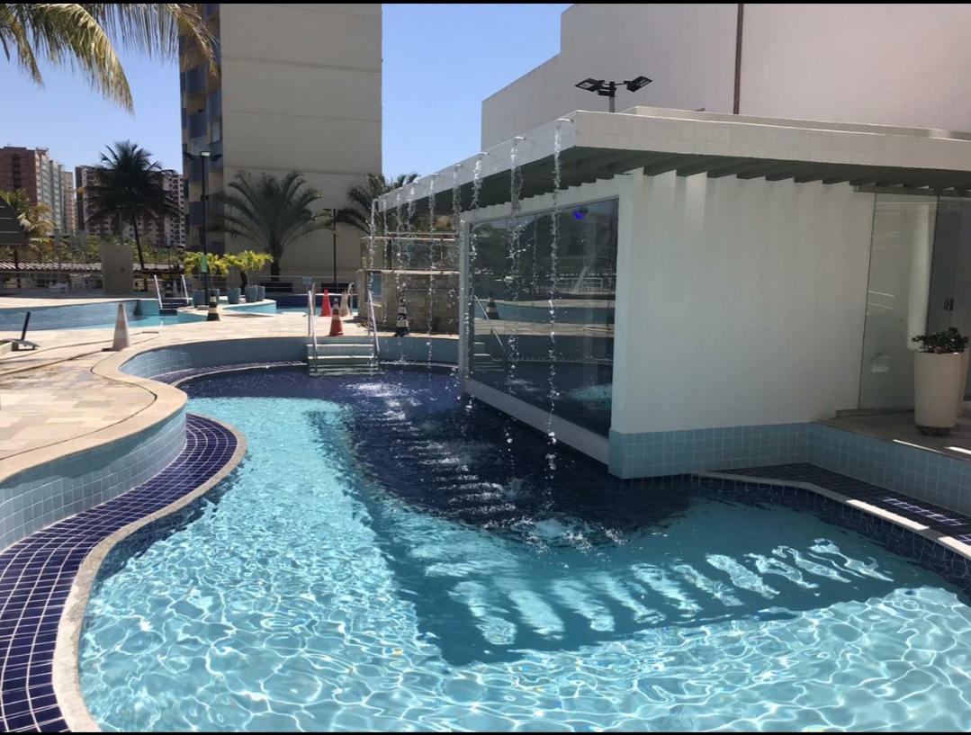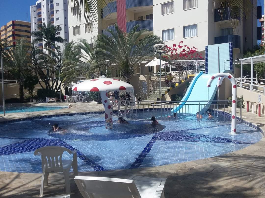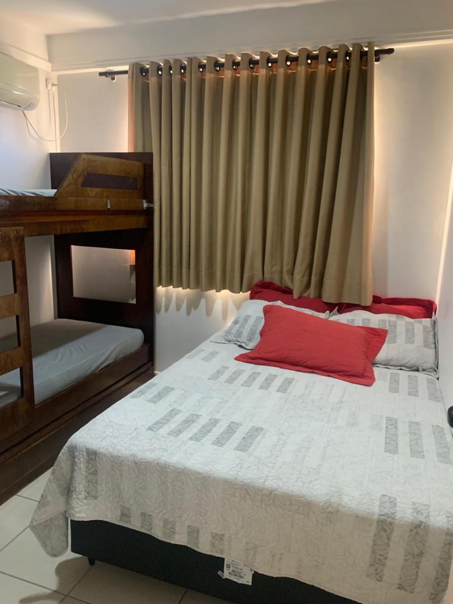 Apartamento mobiliado com suíte e quartos adicionais, ideal para até 7 pessoas, equipado com ar condicionado, cozinha completa e sacada com churrasqueira, além de uma ampla área de lazer para toda a família.